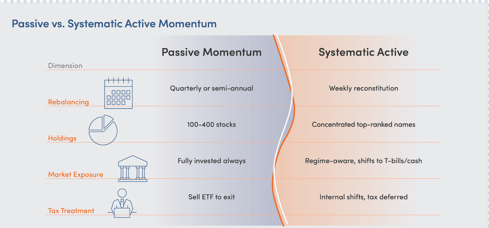 Key Point: Passive momentum ETFs offer discipline and transparency but lack the flexibility to adapt between rebalance windows or manage regime risk.